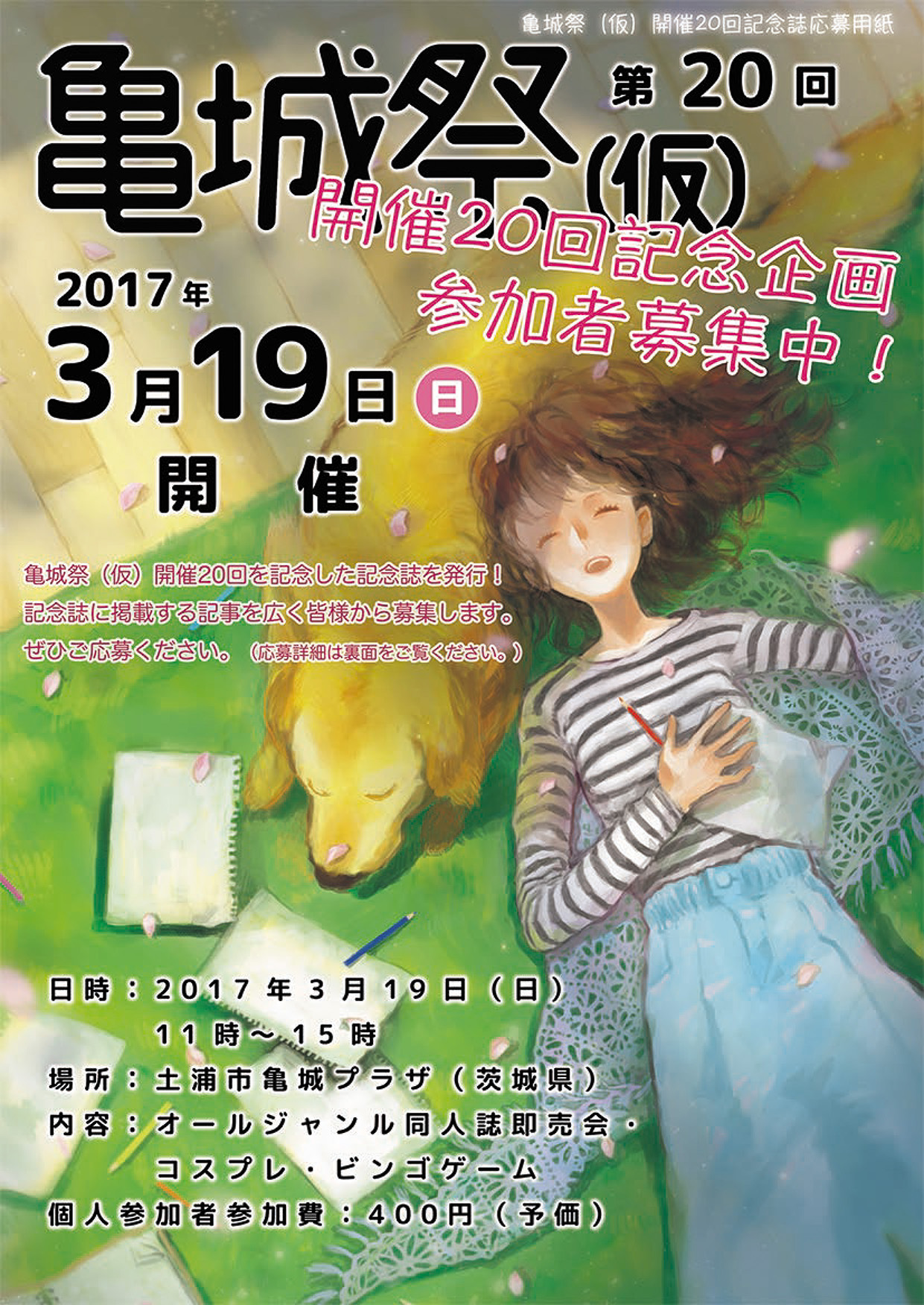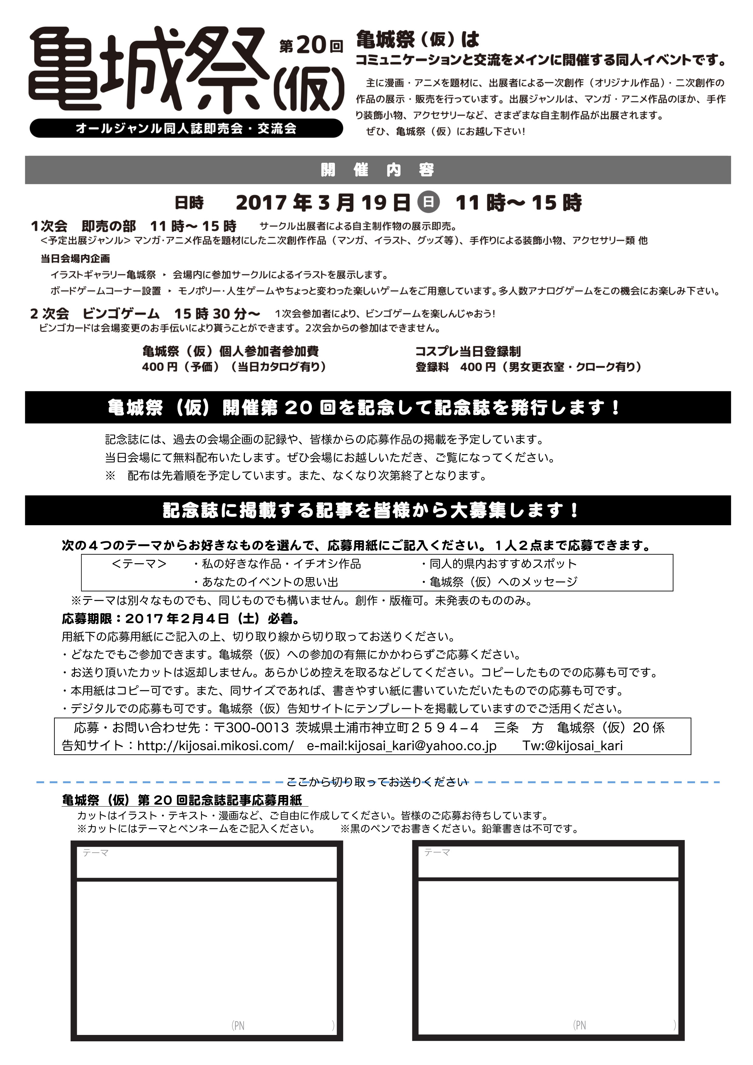 第20回亀城祭(仮)のサークル参加申込みの締め切りは、2月4日(土)必着(送信完了)となっております。