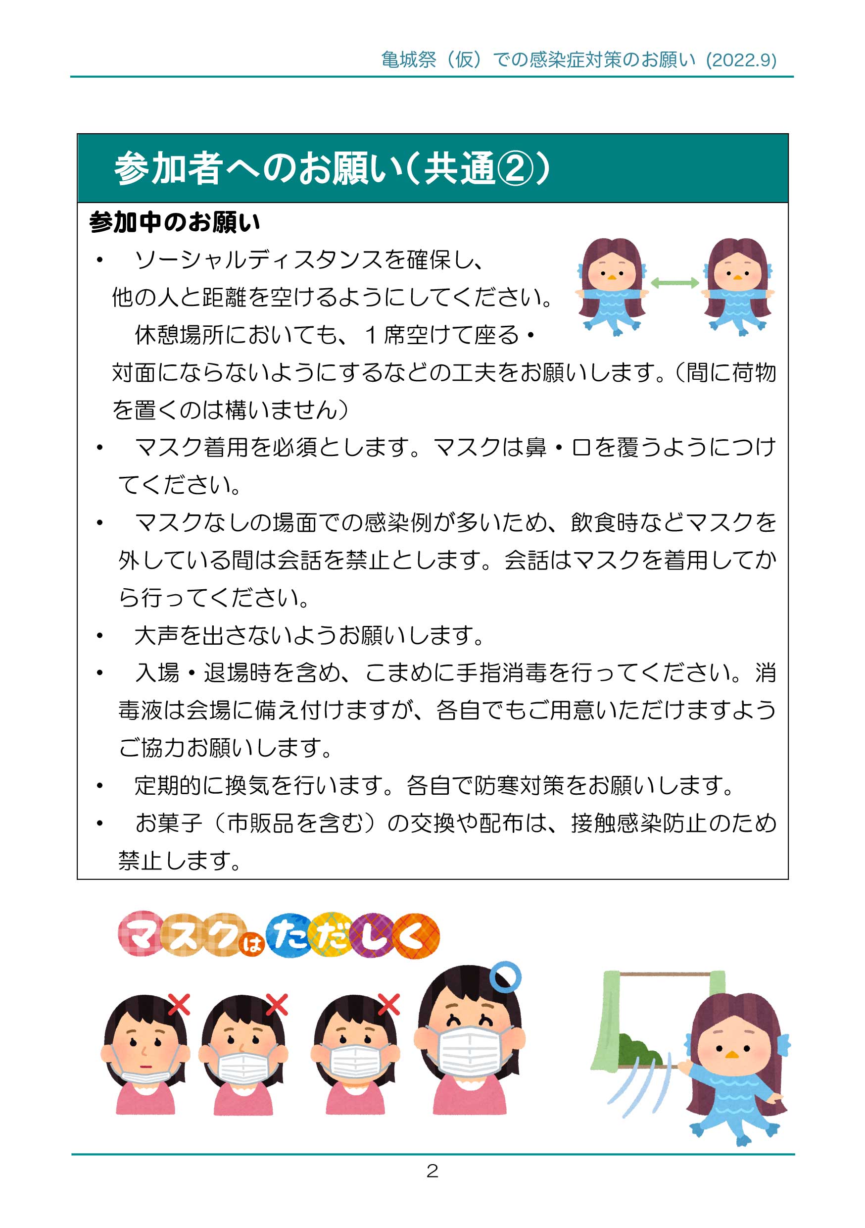 亀城祭(仮)第29回の開催にあたり、新型コロナウイルス感染防止のため、参加者の皆様に基本的な感染対策へのご協力をお願いします。