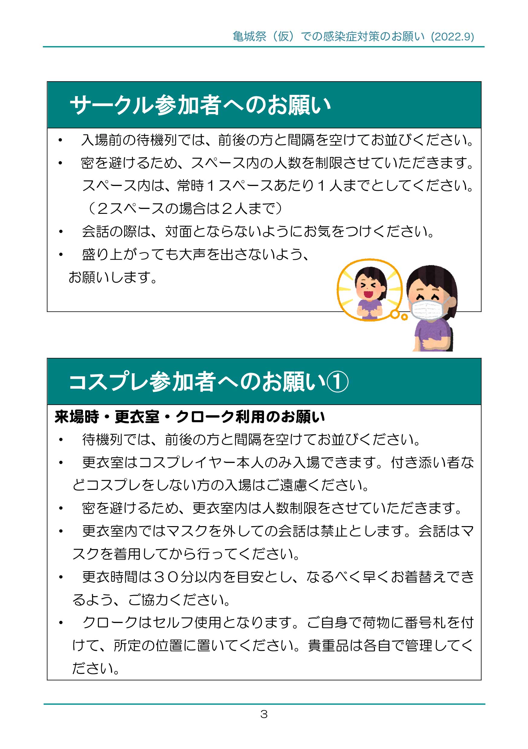 ・マスクを外している間(飲食時、着替え中、コスプレ撮影時など)は、会話を禁止とします。